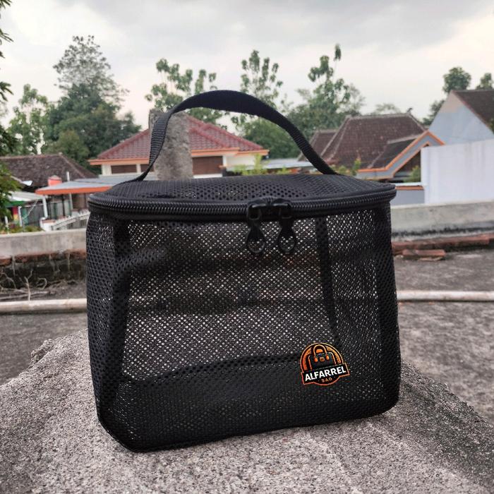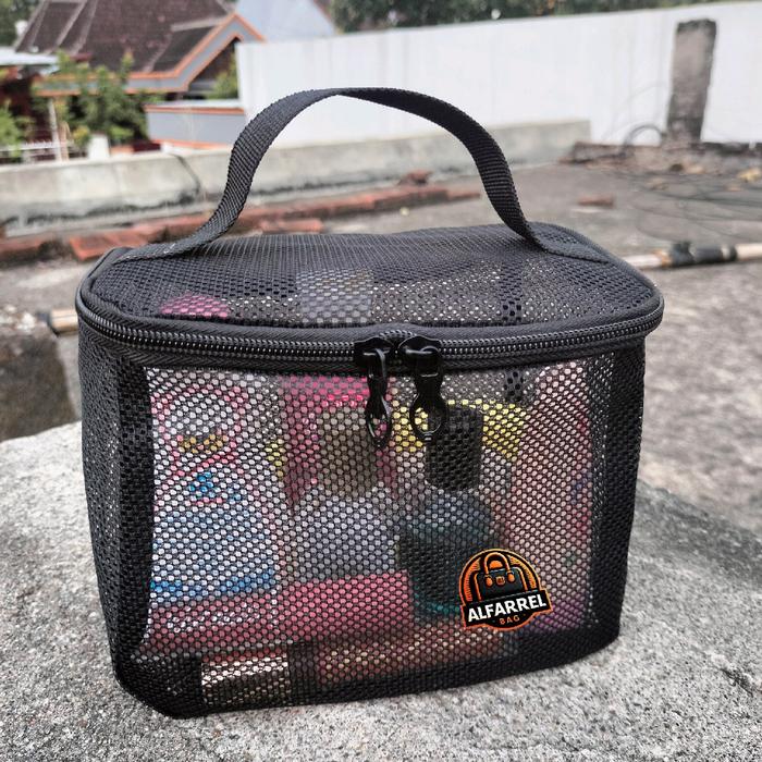 - Mesh: Jenis material yang memiliki tekstur berlubang-lubang seperti jaring. Material ini kuat, fleksibel, dan memberikan sirkulasi udara yang baik, sehingga sangat cocok untuk menyimpan barang yang perlu “bernapas” seperti spons makeup atau kuas.