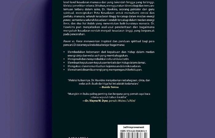 - Medan Energi Power & Force: Konsep inti dalam buku ini. “Force” adalah energi dari kesadaran rendah (seperti malu, rasa bersalah, apatis) yang bersifat memecah belah dan menghabiskan energi. Sementara “Power” adalah energi dari kesadaran tinggi (seperti keberanian, penerimaan, cinta) yang bersifat menyatukan dan memberdayakan.