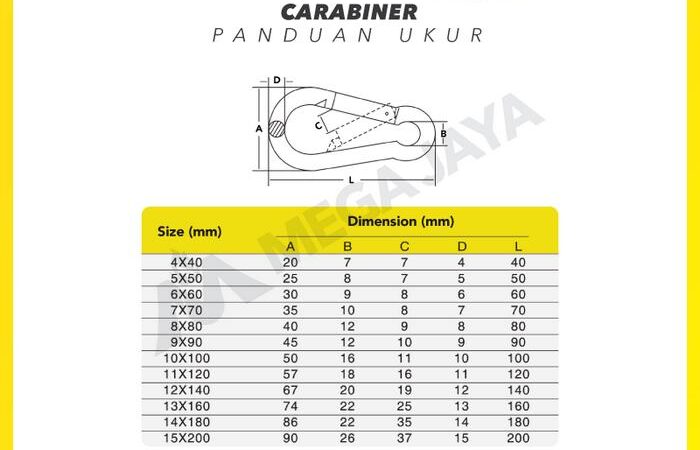 Dirancang untuk kebutuhan terberat, carabiner ini terbuat dari material Baja Galvanis yang sangat kuat dan tahan karat. Dilengkapi dengan mekanisme kunci pengaman berpegas untuk memastikan keamanan maksimal selama penggunaan. Tersedia dalam berbagai pilihan ukuran dari 4mm, 5mm, 6mm, 8mm, 10mm, hingga yang terbesar 12mm untuk memenuhi segala kebutuhan proyek Anda.