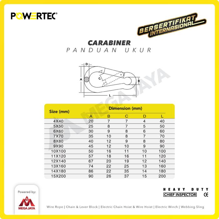 Tingkatkan standar keselamatan dan efisiensi operasional Anda dengan Powertec Carabiner Galvanized. Sebagai distributor tunggal dan resmi seluruh produk Lifting Equipment Powertec, PT Sumber Mega Jaya menjamin keaslian produk 100% yang dibuktikan dengan Inspection Certificate pada setiap unit. Nikmati harga yang sudah include PPN dan fasilitas faktur pajak.