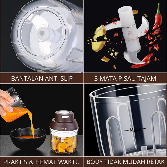 Premio Mini Chopper hadir sebagai solusi! Dilengkapi dengan 3 mata pisau stainless steel super tajam, blender ini memotong dan menghaluskan berbagai bahan dengan sempurna. Ditenagai motor 45 Watt yang kuat, Premio Mini Chopper ideal untuk menggiling bumbu dapur, membuat MPASI, menghaluskan daging, buah, hingga membuat smoothie tanpa perlu repot menggunakan blender besar.