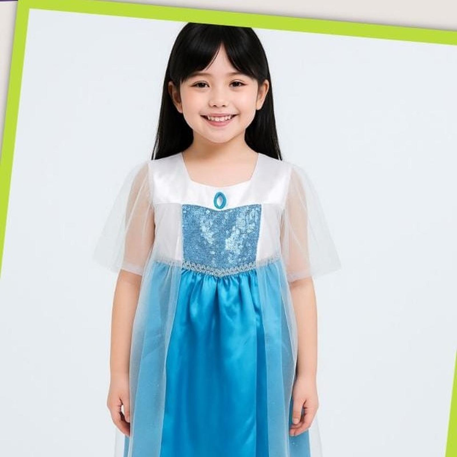 | Desain Autentik | Motif dan siluet gaun didesain menyerupai gaun Elsa dalam film Frozen. Terdapat sleting di belakang untuk memudahkan memakai dan melepas. |