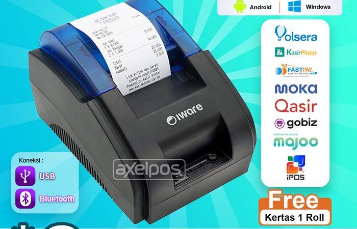 Printer thermal praktis untuk kebutuhan kasir dan PPOB dengan koneksi ganda (Bluetooth & USB). Cetak struk pembayaran dengan cepat dari smartphone Android atau komputer Windows tanpa ribet.