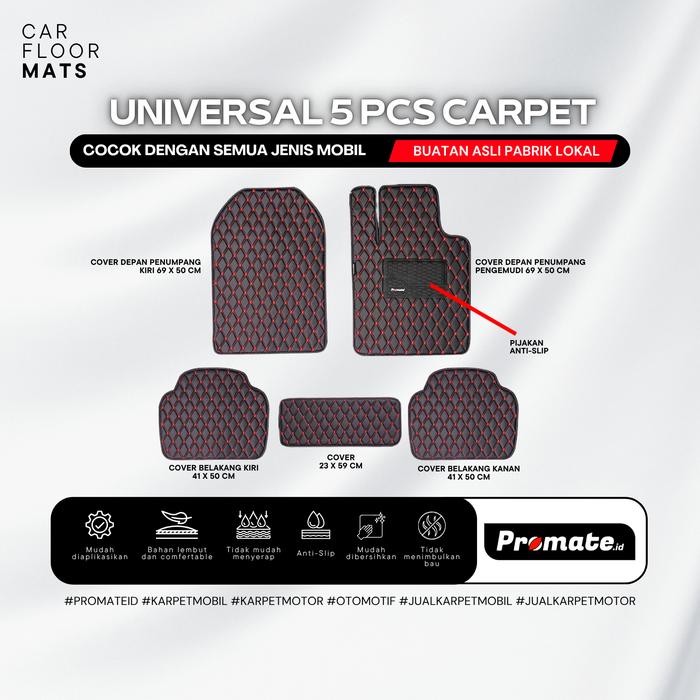 5 potong karpet (2 depan, 1 tengah, 2 samping) dengan material kulit sintetis tahan lama.