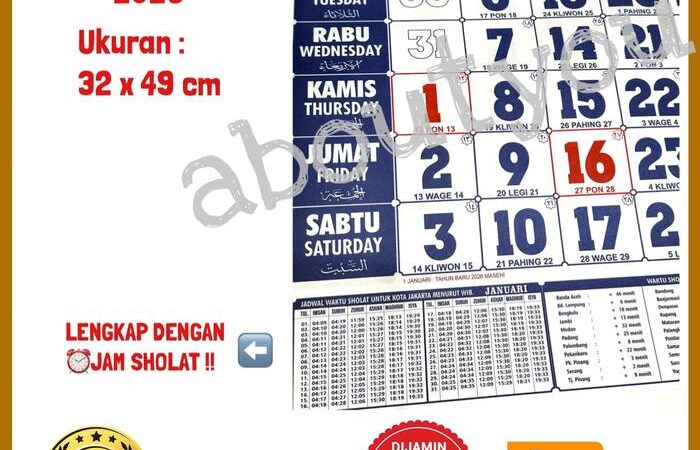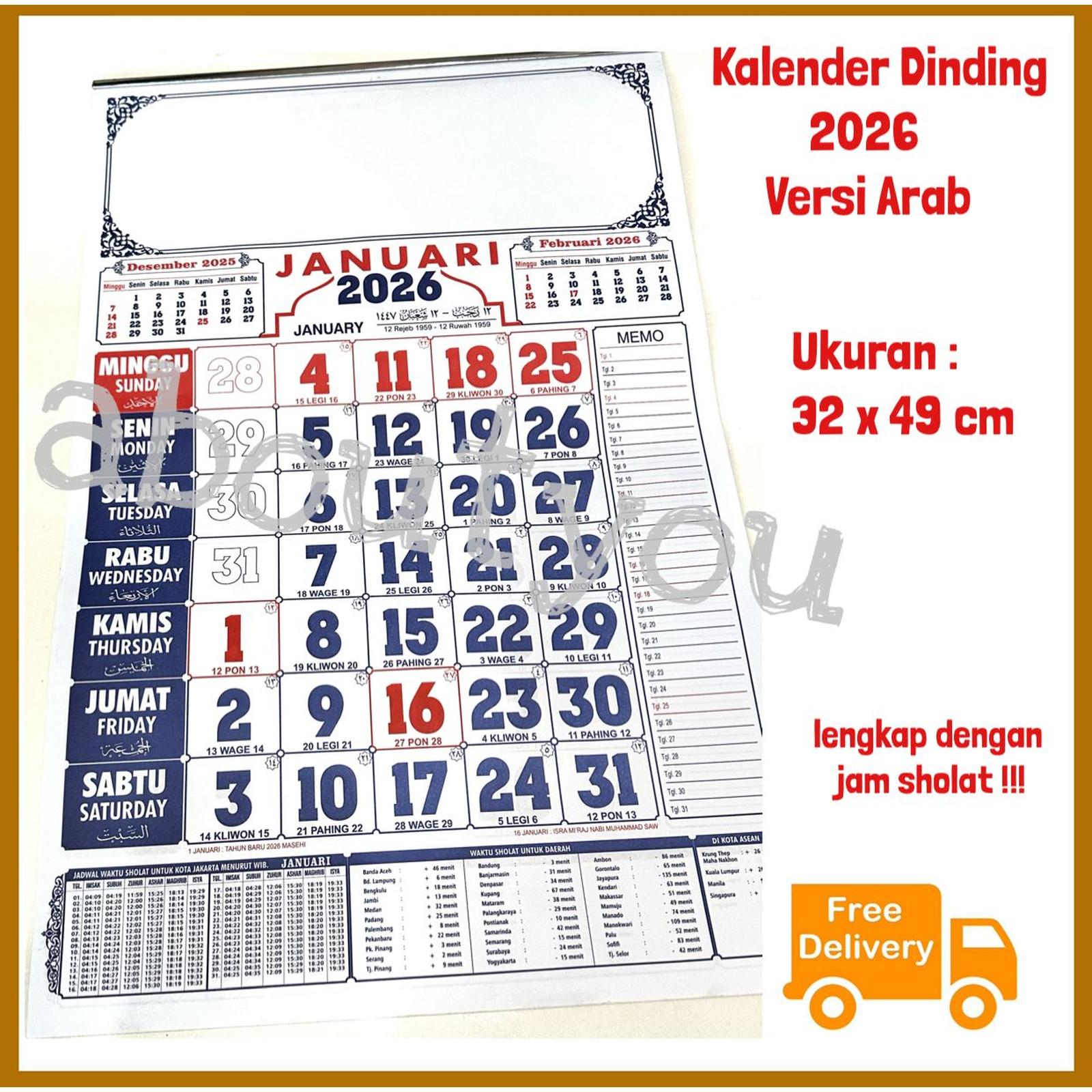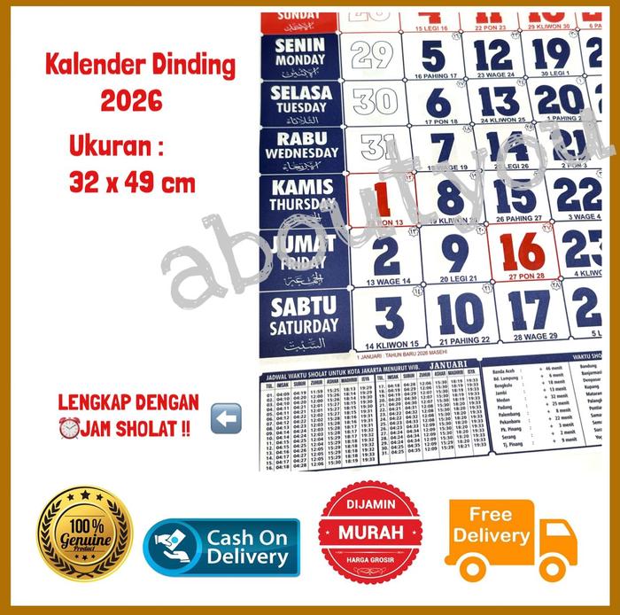 Dapatkan sekarang juga kalender dinding lengkap untuk tahun 2026! Kalender ini menghadirkan dua pilihan versi yang informatif: versi tulisan Arab atau versi tulisan China. Kedua versi telah dilengkapi dengan jadwal waktu sholat dan penanggalan pasaran Jawa (neptu, weton) untuk memenuhi kebutuhan tradisi dan spiritual.