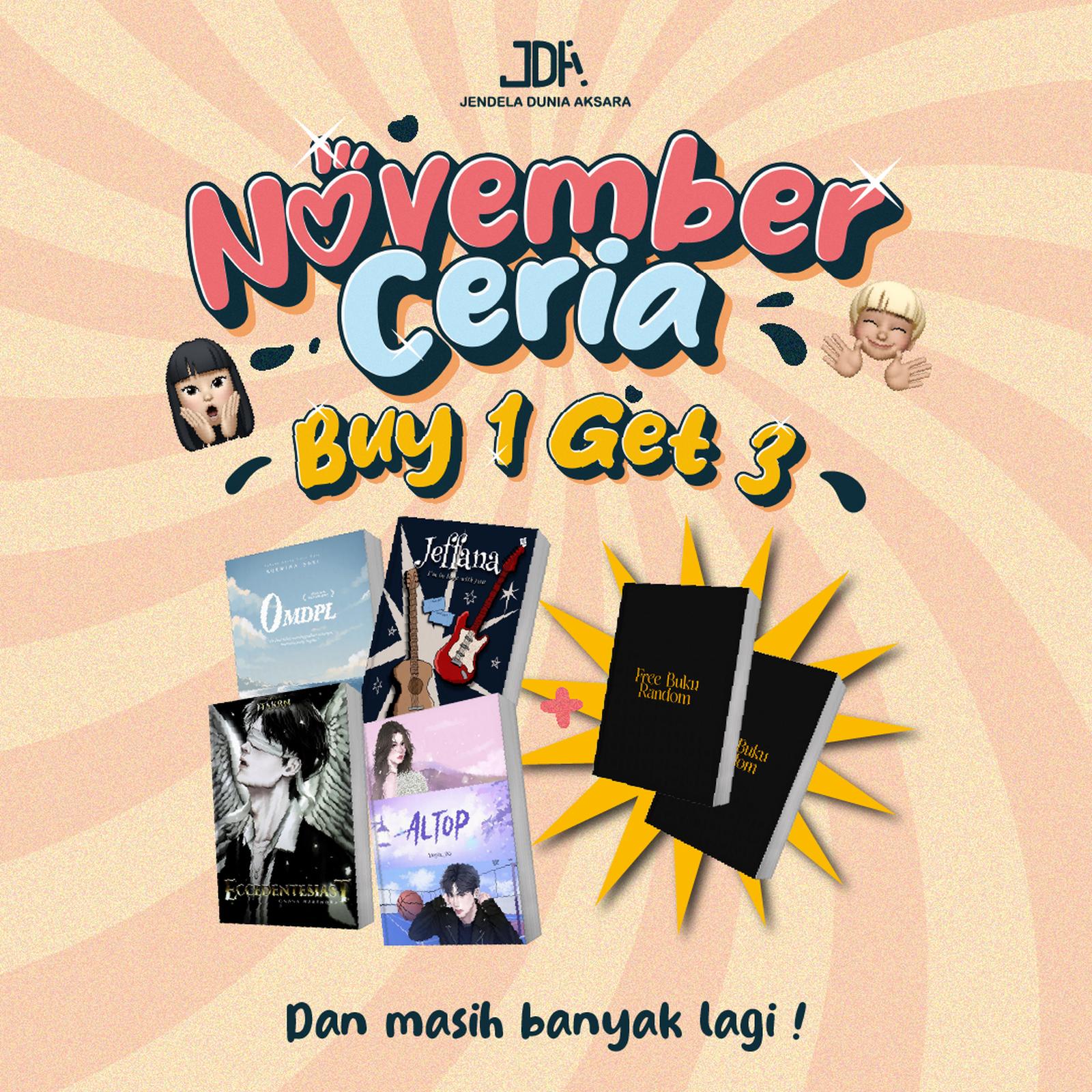 Raih kesempatan istimewa untuk mengembangkan koleksi bacaanmu dengan cara yang paling hemat! Beli 1 novel utama pilihanmu dan dapatkan GRATIS 2 buku random spesial dari JDA Bookstore. Total yang kamu terima adalah 3 buku dengan hanya membayar harga 1 buku saja!