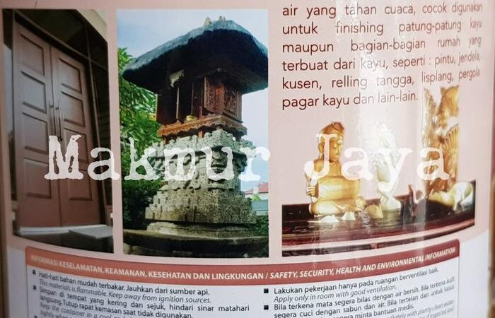 Nikmati berbagai keunggulannya: ramah lingkungan, cepat kering, tahan terhadap cuaca dan jamur, serta mudah diaplikasikan baik dengan kuas maupun spray. Hasilnya halus tanpa meninggalkan jejak kuas, warna merata, dan mampu mengekspos keindahan serat kayu alami. Tersedia dalam pilihan warna Teak, Cherry, Light Walnut, Walnut, Dark Brown, Akasia, Akasia Bali, dan Palisander dengan finish Clear Dof atau Clear Gloss (khusus interior).
