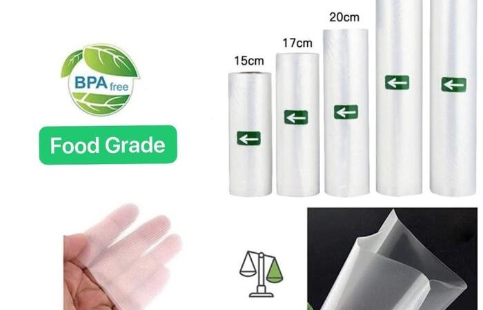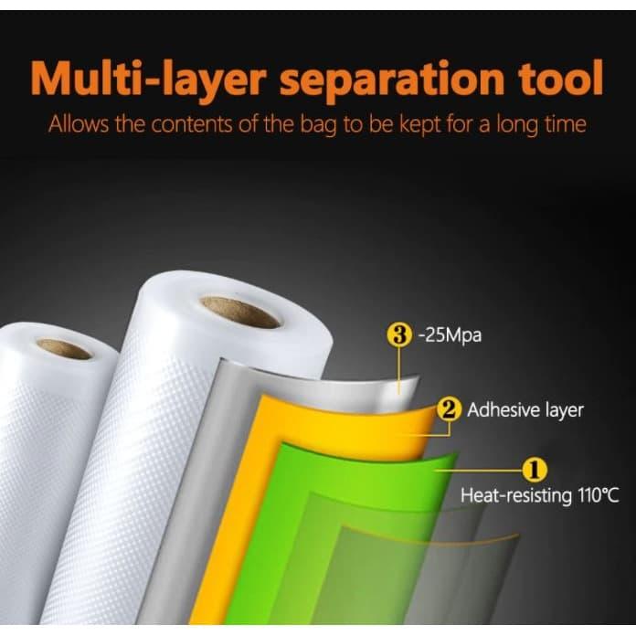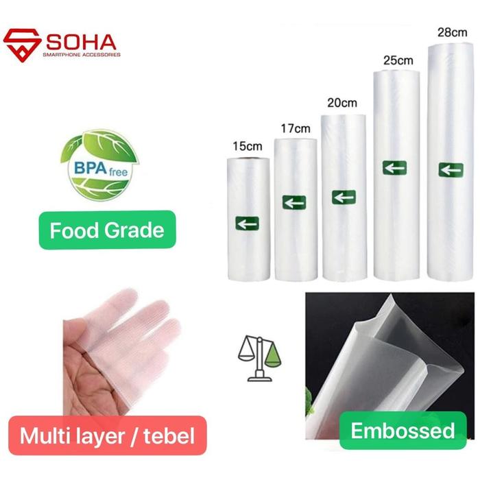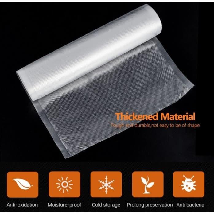 Plastik gulungan (roll) vacuum sealer premium dengan ketebalan 80 micron, bebas BPA, dan bersertifikat food grade. Material ini aman untuk kontak langsung dengan makanan dan dirancang khusus untuk mesin vacuum sealer guna menjaga kesegaran dan memperpanjang umur simpan produk.