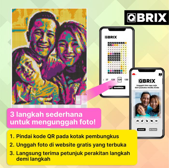 | Kemudahan Pembuatan | Cukup unggah foto ke website QBRIX via QR code dalam kotak, dan panduan lengkap akan dikirim ke email Anda. |