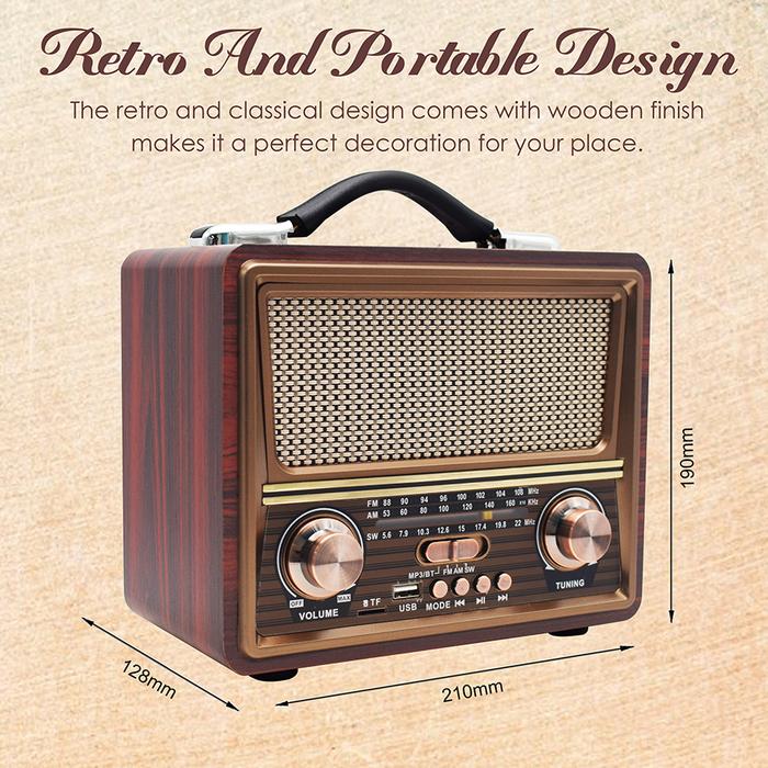 Hadir dengan desain retro yang memukau dan dilapisi serat kayu premium, Radio Meredith-2055BT adalah perpaduan sempurna antara nostalgia dan teknologi modern. Nikmati pengalaman mendengarkan yang versatile melalui Bluetooth, radio FM, USB, TF card, atau input AUX. Perangkat ini adalah teman terbaik untuk segala situasi, baik di rumah, di kantor, atau dalam perjalanan Anda.