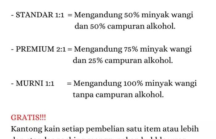 - Konsentrasi Standar (1:1): Campuran parfum murni dengan alkohol dalam rasio yang seimbang, memberikan aroma yang tetap berkualitas dengan harga yang lebih terjangkau.