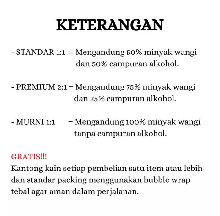 - Konsentrasi Premium (2:1): Campuran parfum murni dengan alkohol dalam rasio 2 bagian parfum dan 1 bagian alkohol, menghasilkan wewangian yang kuat dan tahan lama.