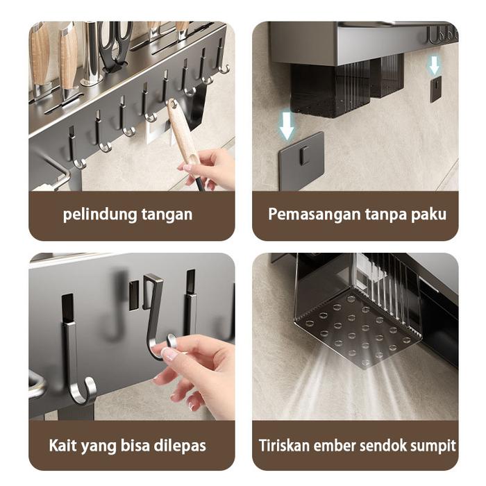 Manfaat utama produk ini termasuk desain sudut yang memaksimalkan ruang mati, kapasitas penyimpanan besar untuk pisau, sendok, garpu, dan lap. Slot khusus pisau melindungi mata pisau dari goresan. Yang terpenting, rak ini menggunakan sistem tempel tanpa bor, sangat mudah dipasang oleh siapa saja tanpa merusak dinding. Cukup tekan hingga merekat dengan kuat, desain terbukanya memudahkan akses dan pembersihan.