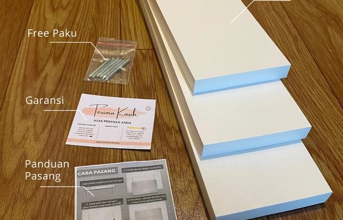 - Aksesoris Pemasangan: Semua perlengkapan yang diperlukan untuk memasang rak, yang biasanya termasuk braket (pengait), sekrup, dowel, dan instruksi pemasangan.