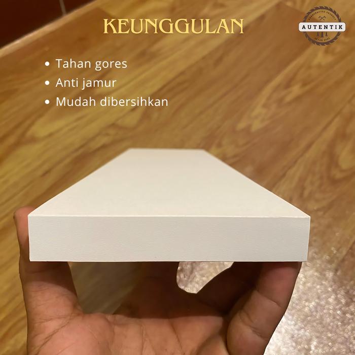 - Finishing HPL (High-Pressure Laminate): Pelapis permukaan yang dibuat di bawah tekanan dan suhu sangat tinggi. Material ini dikenal sangat keras, tahan gores, tahan kelembapan, dan tersedia dalam berbagai motif serta tekstur modern.