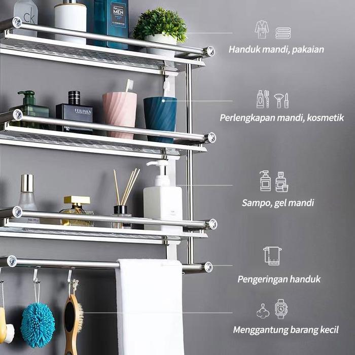 Bingung menyimpan handuk, sabun, dan perlengkapan mandi lainnya? Rak kamar mandi stainless steel ini solusinya! Terbuat dari bahan SUS 304 berkualitas tinggi, tahan karat, dan mudah dibersihkan. Desainnya minimalis namun fungsional, cocok untuk segala jenis dekorasi kamar mandi.