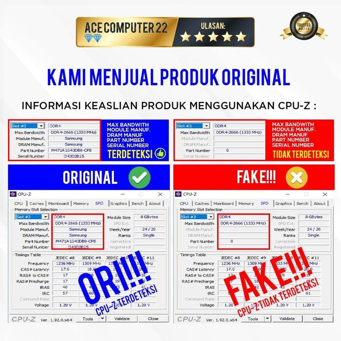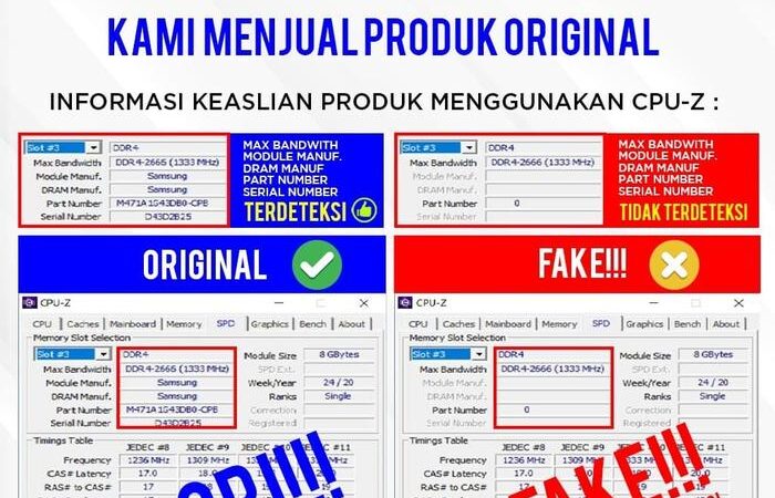Pastikan RAM terdeteksi lengkap di software CPU-Z pada tab Memory dan SPD. Module Manufacture dan Part Number harus terbaca. Jika tidak terdeteksi, kemungkinan besar produk palsu.