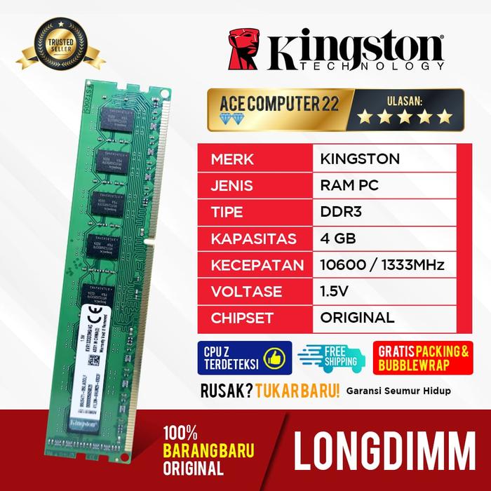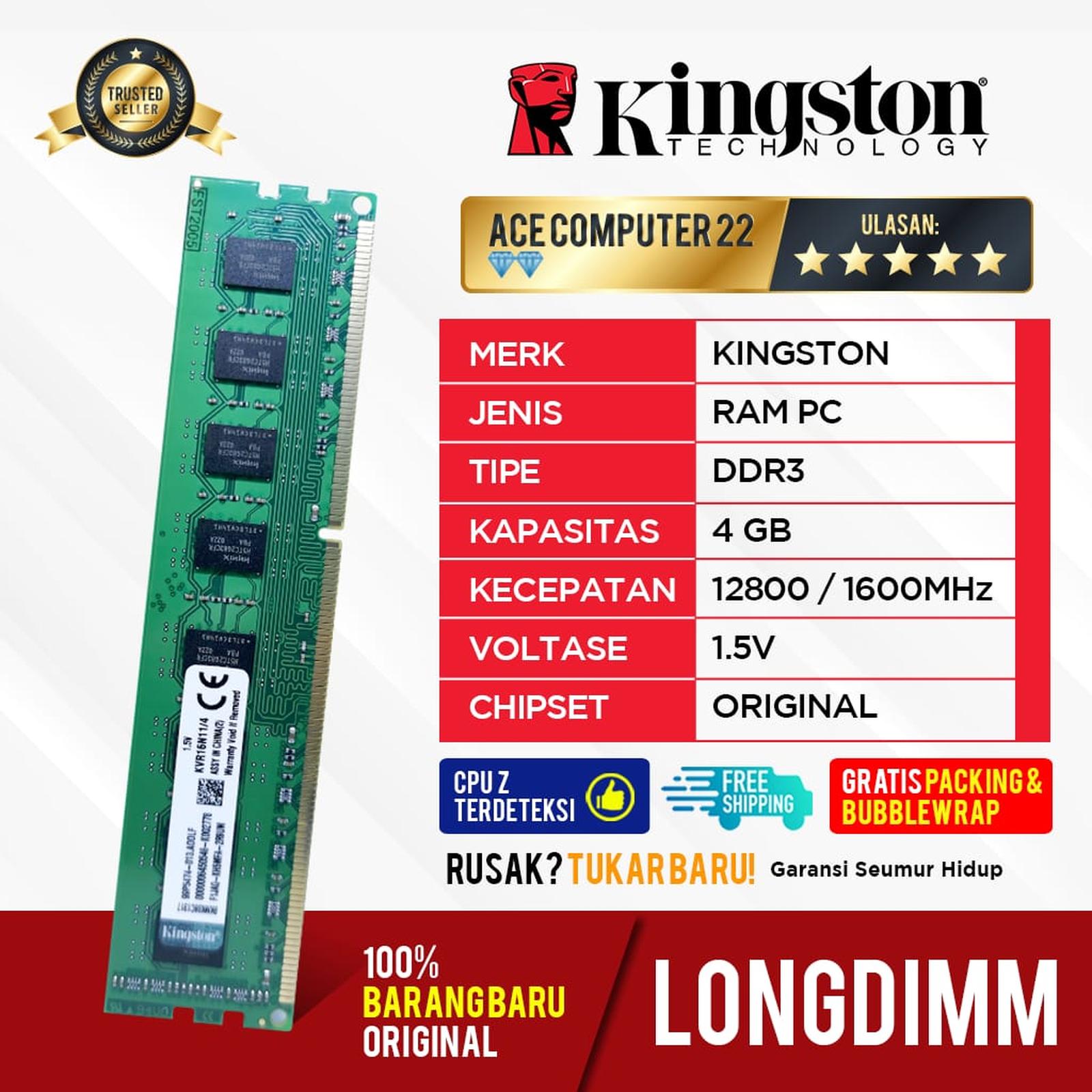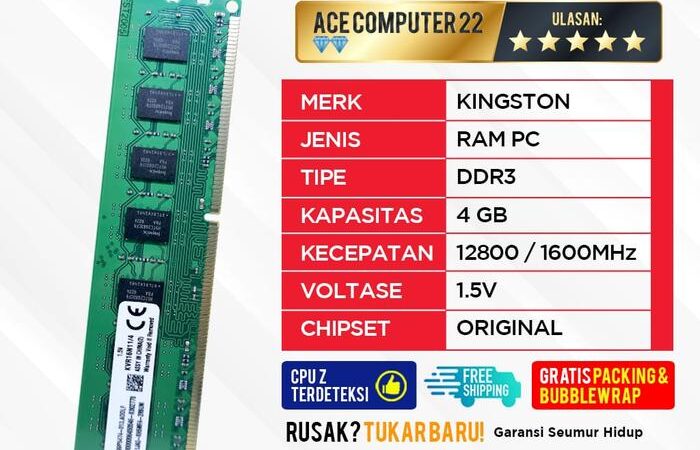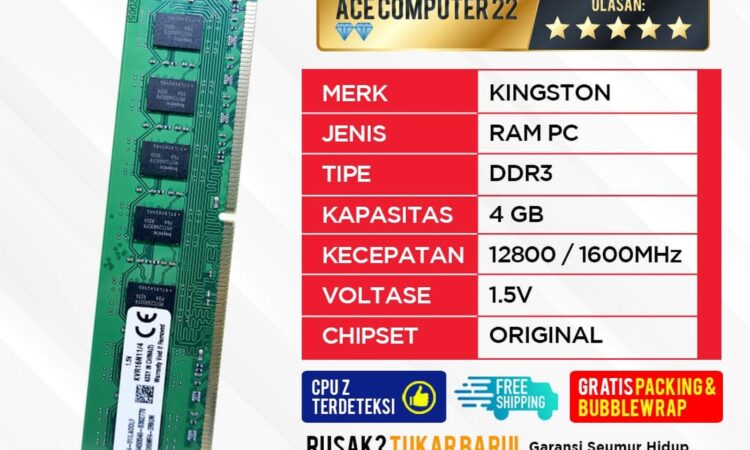Ace Computer menjual RAM Kingston DDR3 4GB berkualitas tinggi untuk upgrade PC Anda. Tersedia dalam dua tipe speed: PC-12800 (1600MHz) dan PC-10600 (1333MHz). Kompatibel dengan semua motherboard yang mendukung DDR3 (PC3). Barang 100% baru dan original, bukan rekondisi atau kw.