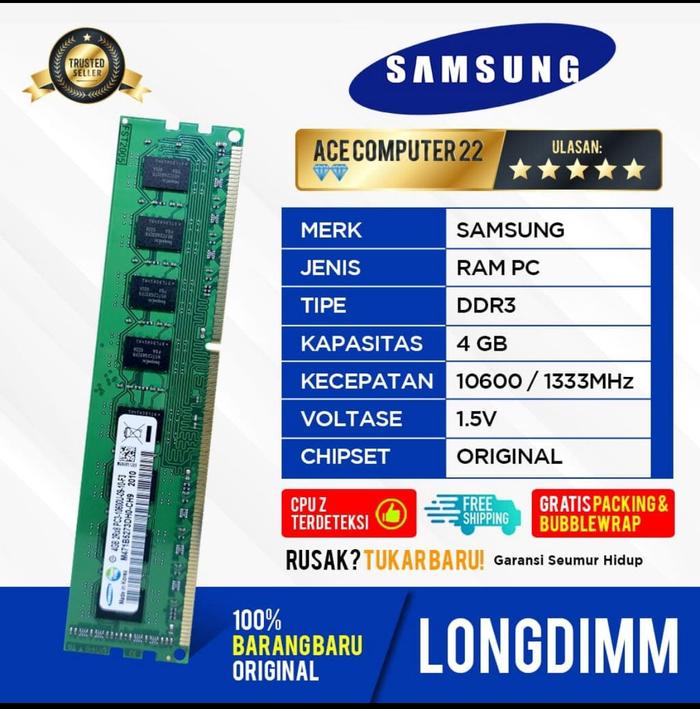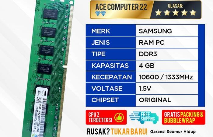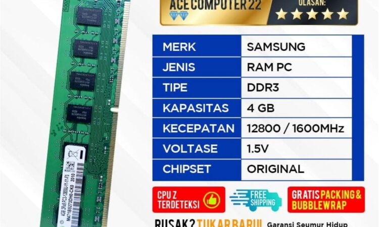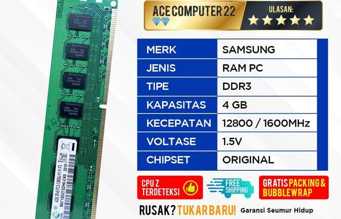 Ace Computer menghadirkan RAM Samsung DDR3 4GB asli dan baru dengan garansi seumur hidup. Tersedia dua tipe kecepatan: PC12800 (DDR3-1600) dan PC10600 (DDR3-1333). Kompatibel dengan semua motherboard yang mendukung DDR3 dan menjamin performa optimal untuk upgrade PC atau laptop Anda.