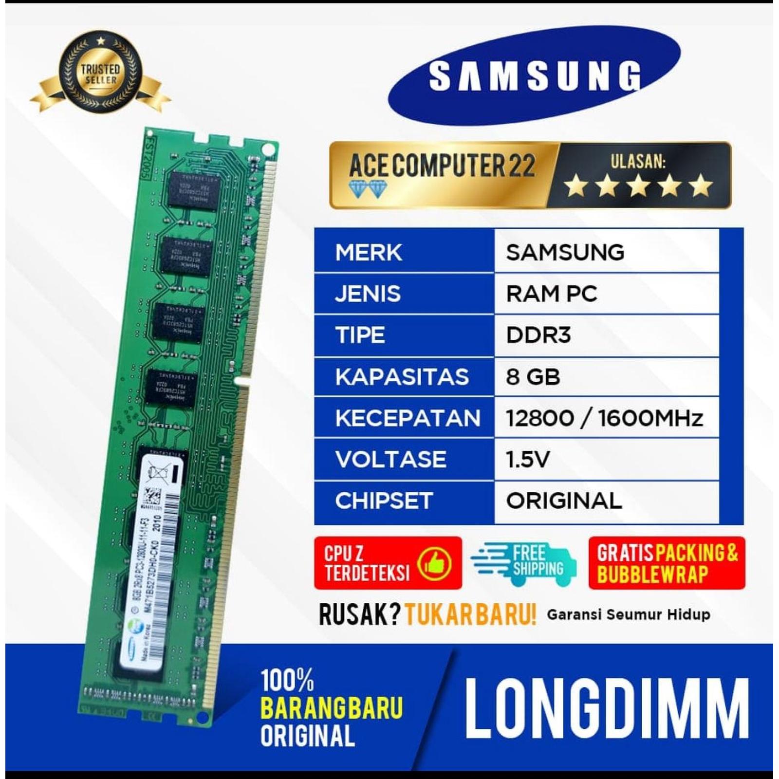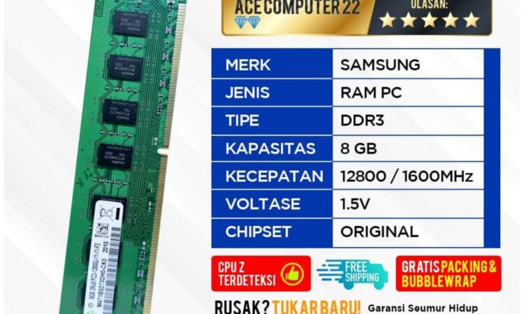 Ace Computer menyediakan RAM Samsung DDR3 8GB PC12800 (PC3-12800) yang baru dan asli dengan kualitas premium. Spesifikasi produk kami menjamin kompatibilitas tinggi untuk semua motherboard yang mendukung DDR3.