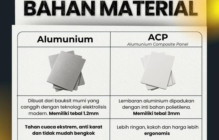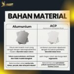 - ACP (Aluminium Composite Panel) – Material panel terdiri dari dua lapisan aluminium dengan inti polietilena, ringan namun kuat.