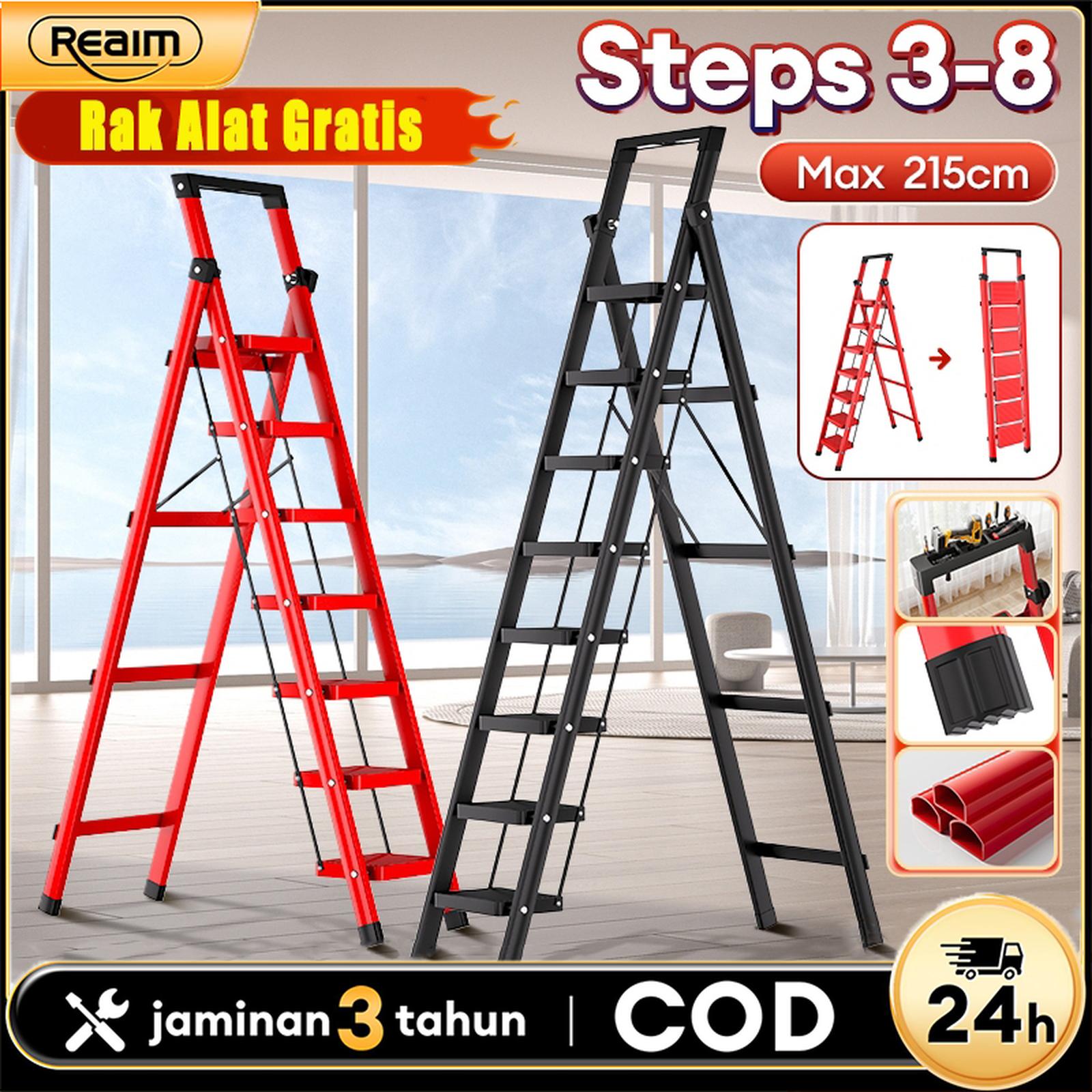 Tersedia dalam pilihan 3, 4, 5, 6, dan 7 langkah dengan warna merah, putih, atau hitam. Tangga lipat Reaim dirancang untuk berbagai keperluan di rumah, kantor, atau workshop. Dibangun dari rangka besi baja karbon berkualitas tinggi dengan lapisan bubuk (powder coating) yang tahan lama dan estetis, tangga ini menawarkan kapasitas beban maksimal hingga 300 kg.