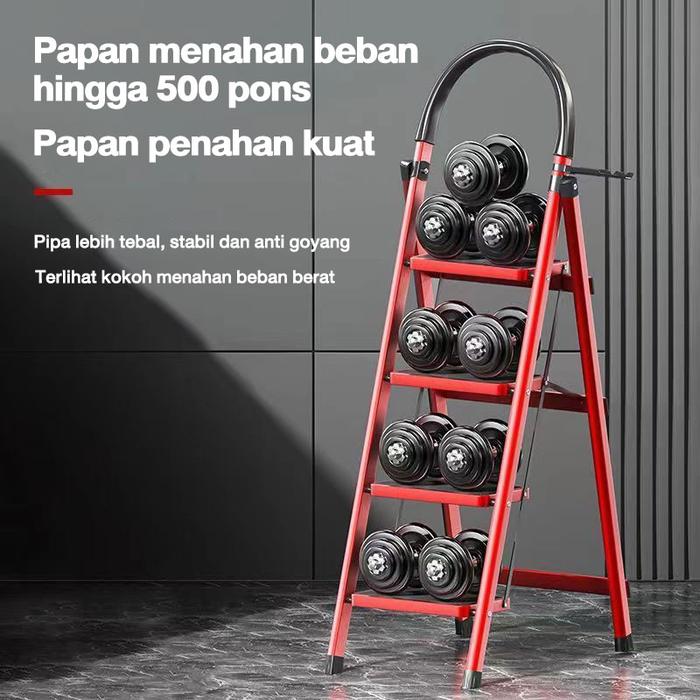 Dua batang logam horizontal memperkuat struktur secara keseluruhan, menjamin stabilitas dan keamanan maksimal saat digunakan. Setiap anak tangga didesain lebar dan dilapisi material anti-selip untuk memberikan traction yang optimal. Setelah digunakan, tangga dapat dilipat rata dengan lebar simpan hanya 5 cm, menjadikannya solusi penyimpanan yang sangat hemat ruang. Dilengkapi juga dengan bantalan kaki anti-selip yang melindungi permukaan lantai dari goresan.