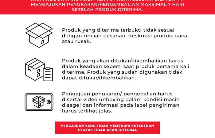 - Pengembalian hanya berlaku jika barang masih tersegel dan belum digunakan, namun rusak/cacat/salah kirim.