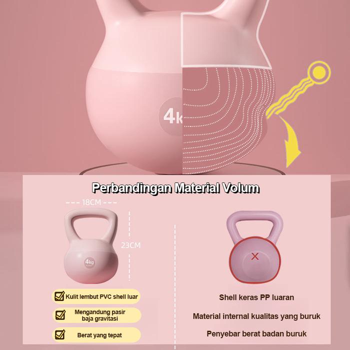 - Kettlebell Lembut (Soft Kettlebell): Jenis kettlebell yang bagian luarnya dilapisi material PVC lembut, berbeda dengan kettlebell tradisional yang terbuat dari besi keras. Dirancang untuk mengurangi noise, mencegah kerusakan lantai, dan memberikan kenyamanan lebih pada pergelangan tangan.