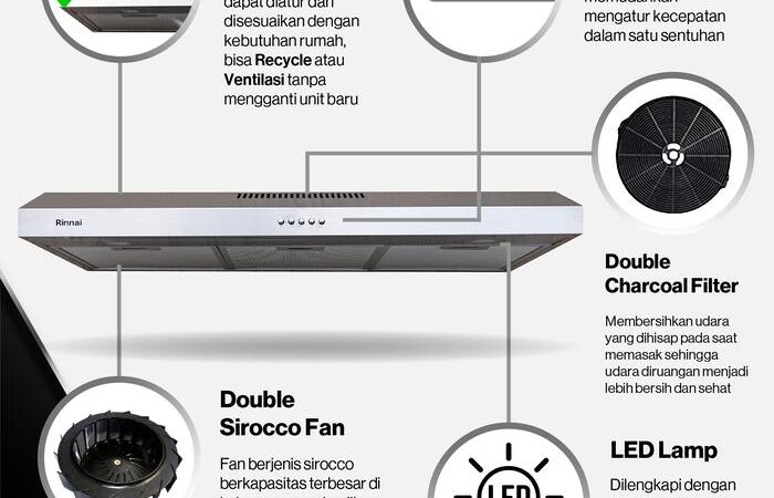 - Recycle/Ventilation System: Sistem yang memungkinkan cooker hood beroperasi dalam dua mode: mode ventilasi (membuang udara kotor langsung keluar) atau mode resirkulasi (menyaring udara dan mengembalikan udara bersih ke dalam ruangan).