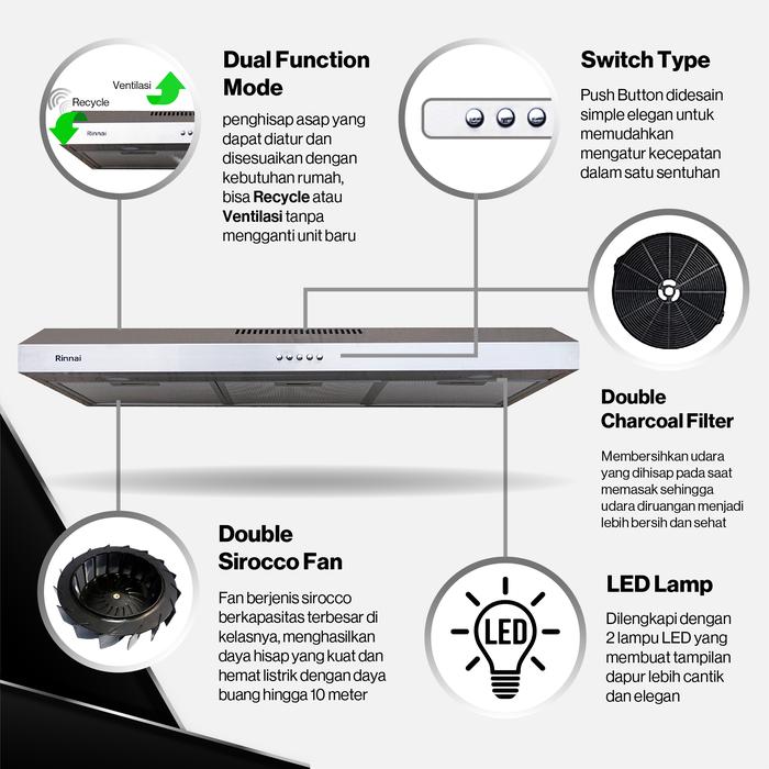 Didesain dengan teknologi Double Sirocco Fan untuk daya hisap yang lebih kuat dan merata, menjadikan dapur Anda bebas dari asap, bau, dan uap minyak. Dilengkapi dengan Recycle/Ventilation System yang memungkinkan Anda memilih mode sirkulasi udara sesuai kebutuhan. Fitur Low Noise Level memastikan operasinya tetap tenang tanpa mengganggu kenyamanan. Serta dilengkapi Charcoal Filter yang efektif menyerap bau tak sedap.