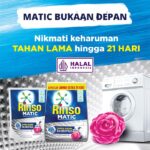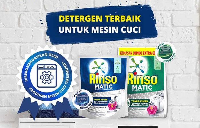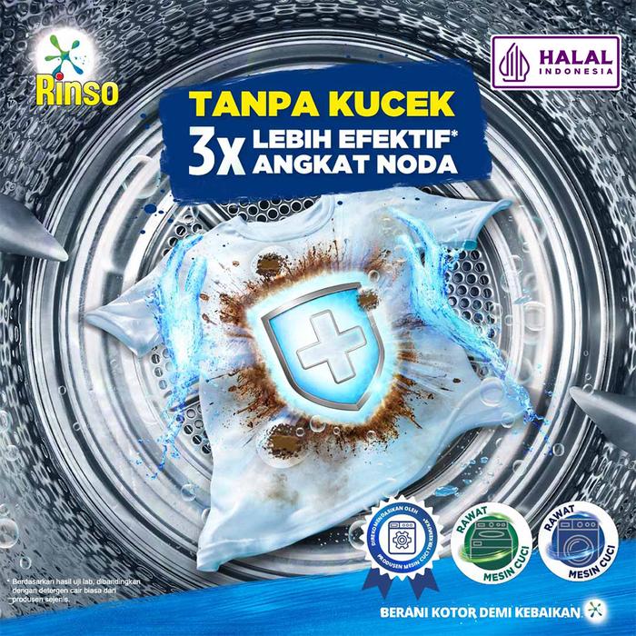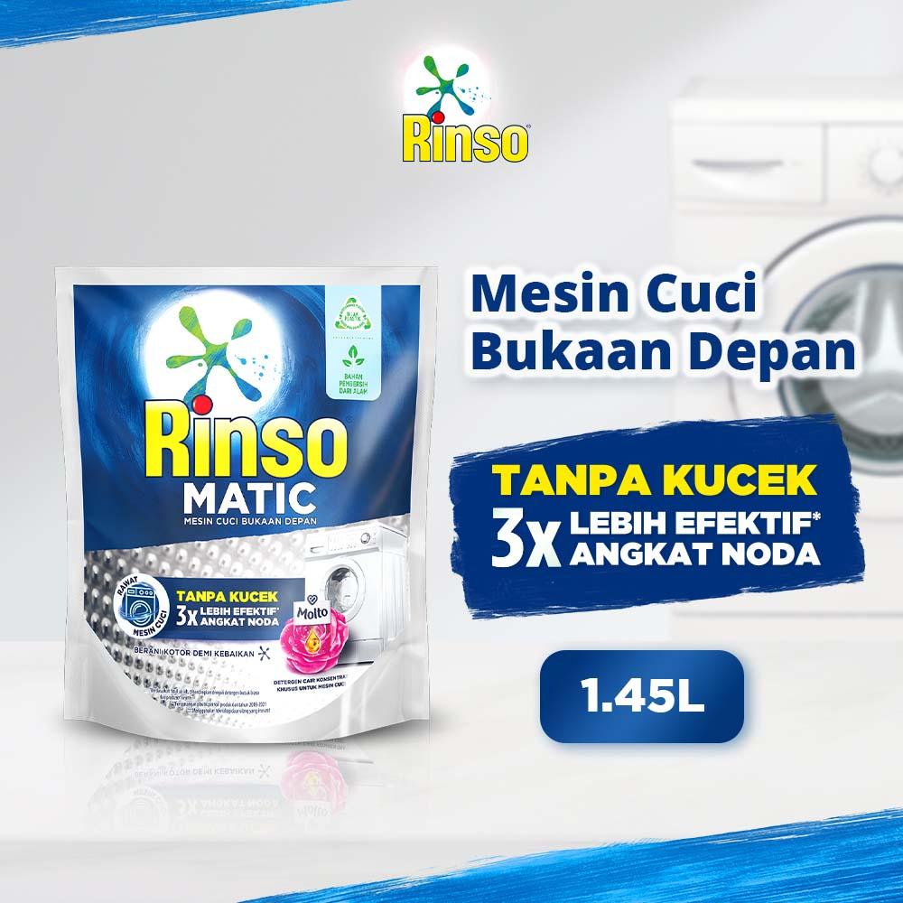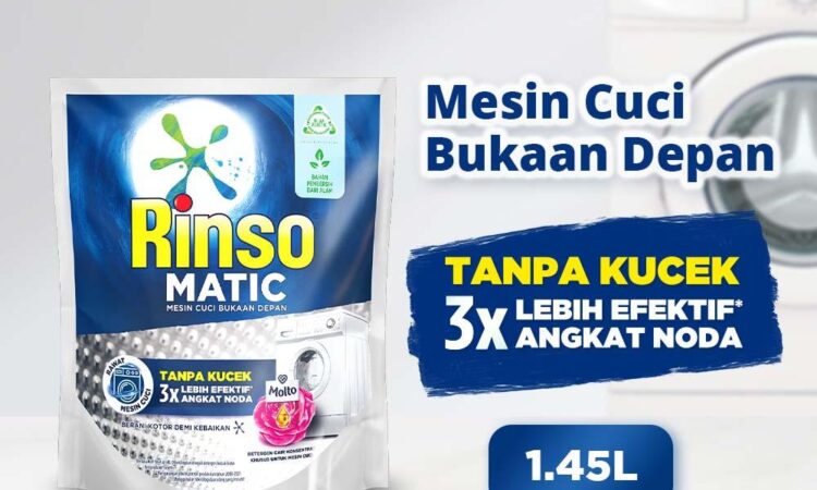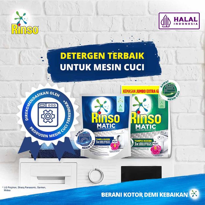 - Surfaktan: Zat aktif dalam deterjen yang berfungsi menurunkan tegangan permukaan air, sehingga mampu melepas dan mengangkat kotoran serta noda dari serat pakaian. Surfaktan dalam Rinso Matic mudah terurai (biodegradable) sehingga lebih ramah lingkungan.