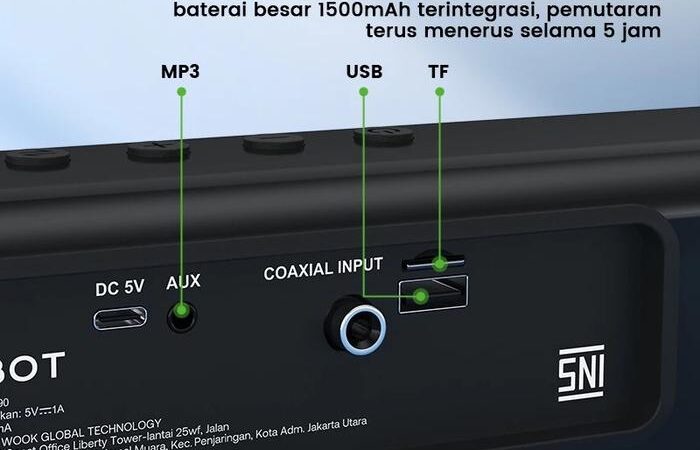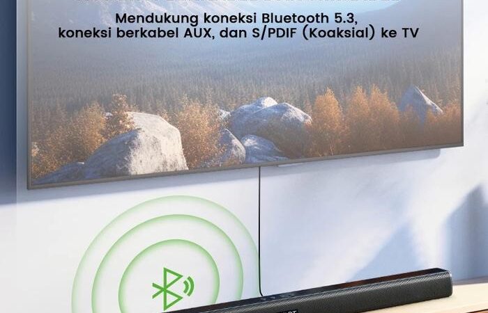 KonektivitasBluetooth 5.3 untuk transmisi cepat dan stabil hingga 10 meter, plus koneksi AUX kabel dan nirkabel (dual connection).