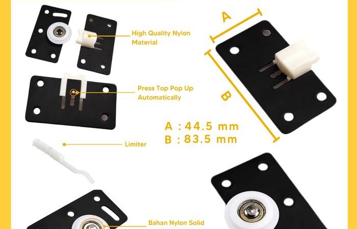 - Set: Satuan penjualan produk ini. Satu set berisi satu roda bawah, satu pengaman atas, dan satu stopper yang berfungsi sebagai sistem lengkap untuk satu sisi pintu.