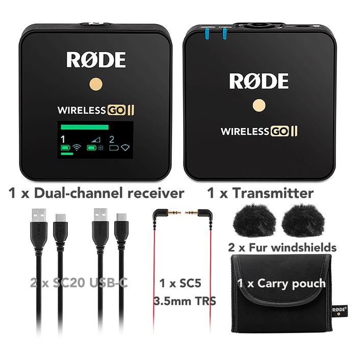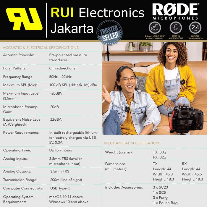 | Konten Paket | 1x Receiver dual-channel, 1x Transmitter, 2x Fur windshield, 2x Kabel USB-C (SC20), 1x Kabel 3.5mm TRS (SC5), 1x Tas carry pouch |