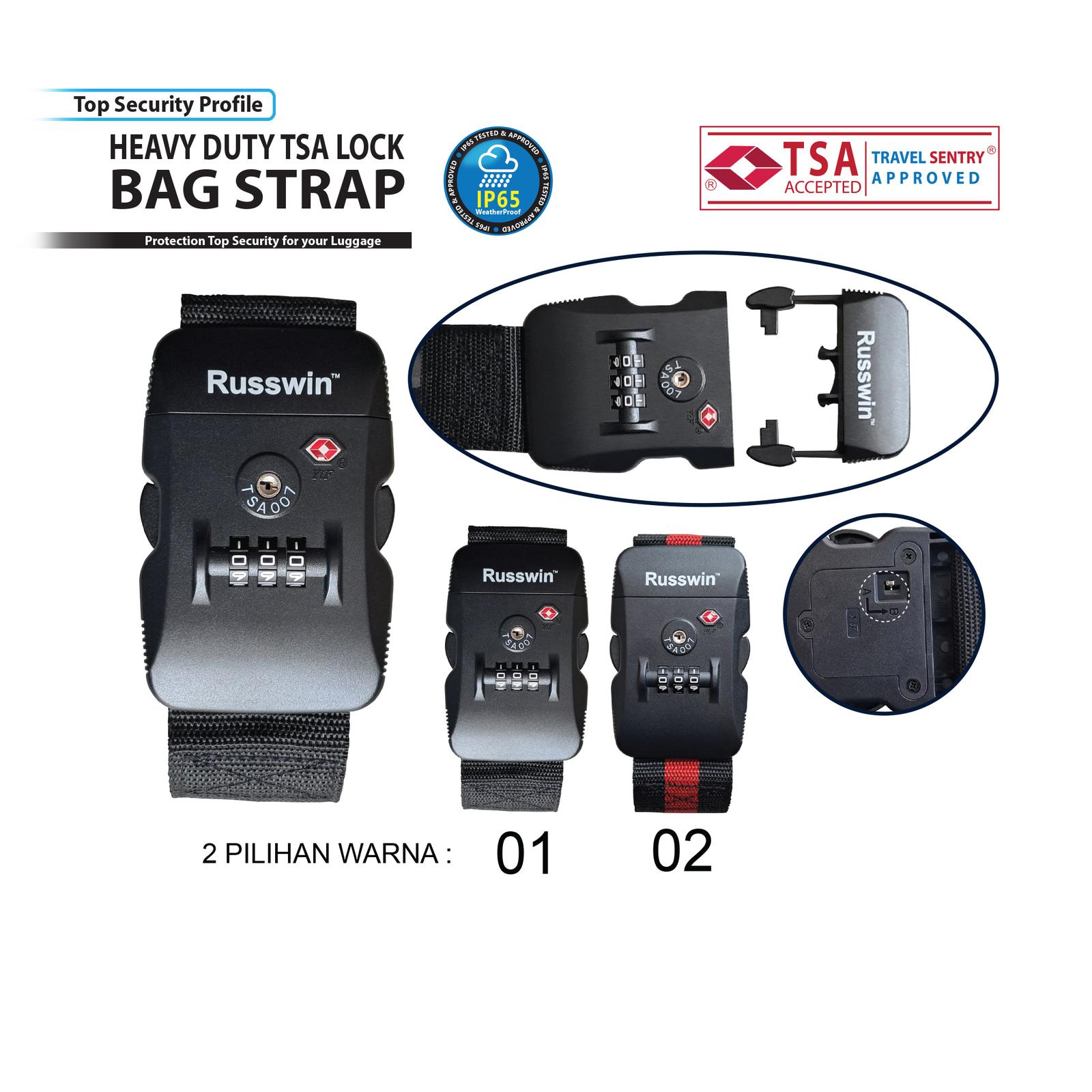Tingkatkan keamanan perjalanan Anda dengan Tali Koper Russwin yang dilengkapi kombinasi kunci 3 digit. Terbuat dari bahan nylon kuat dan kunci ABS kokoh, strap ini dirancang untuk mengamankan koper Anda dari upaya pembukaan tidak sah dan menahan beban berat.