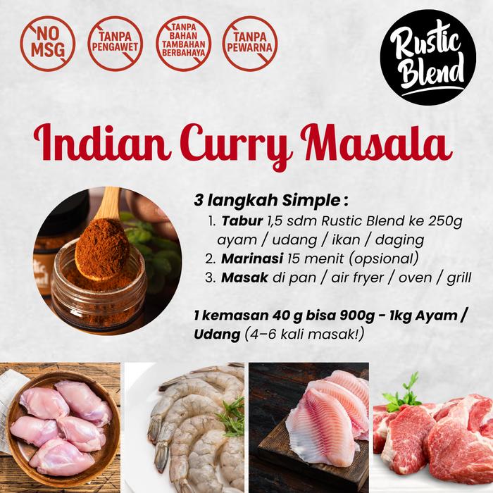 Komposisi: Paprika Bubuk, Kunyit Bubuk, Ketumbar Bubuk, Jinten Bubuk, Garam Masala, Jahe Bubuk, Bawang Putih Bubuk, Cabai Bubuk, Garam, Lada Hitam Bubuk.