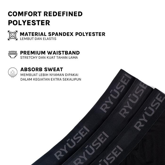 Boxer Ryusei dirancang untuk memberikan kenyamanan maksimal dengan material premium yang lembut dan elastis. Dibuat dari campuran polyester spandex berkualitas tinggi, boxer ini menawarkan fleksibilitas sempurna untuk aktivitas sehari-hari. Setiap pembelian paket 3 Pcs memberikan nilai tambah dengan harga lebih hemat dan packaging eksklusif.