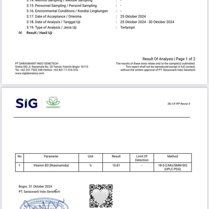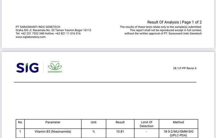 - Niacinamide: Bentuk vitamin B3 yang berfungsi untuk mencerahkan kulit, mengurangi pori-pori, dan memperbaiki lapisan pelindung kulit.