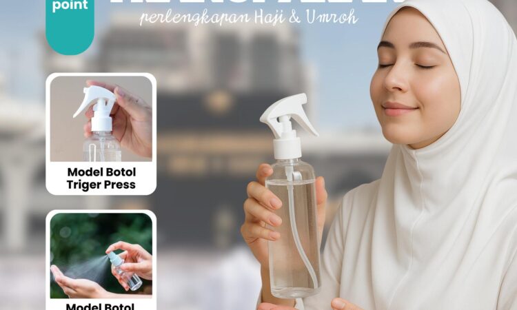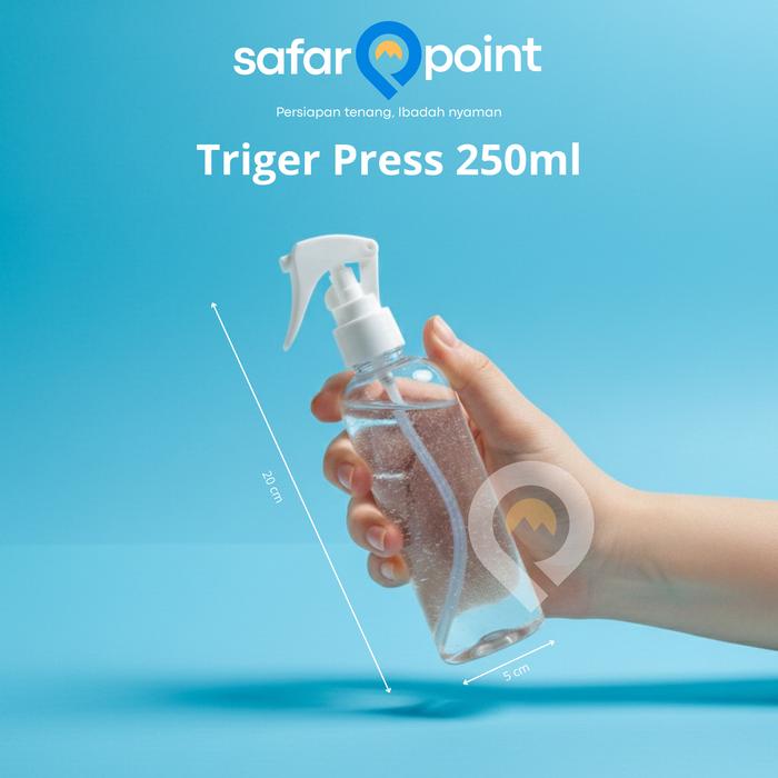 | Botol Spray Trigger Press | Dilengkapi trigger press untuk semprotan halus dan merata, kapasitas besar 250ml, terbuat dari plastik berkualitas tinggi. | Ideal untuk berwudhu secara lengkap, menyimpan parfum, atau cairan penyejuk. |