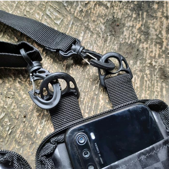 | Fitur Utama | – Waterproof (D300 anti-air) – 1 saku utama + 1 saku depan berresleting – 4 slot kartu – Ruang handphone & uang – Lubang handsfree – Tali webbing adjustable (max 110 cm) |