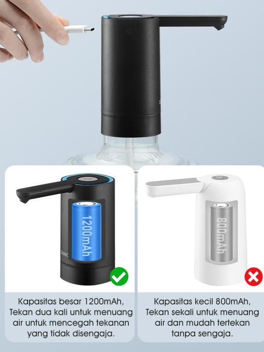 Kapasitas Baterai1200mAh, cukup untuk mengisi hingga 5 galon air dalam satu kali pengisian penuh.