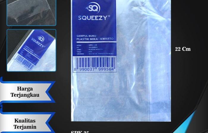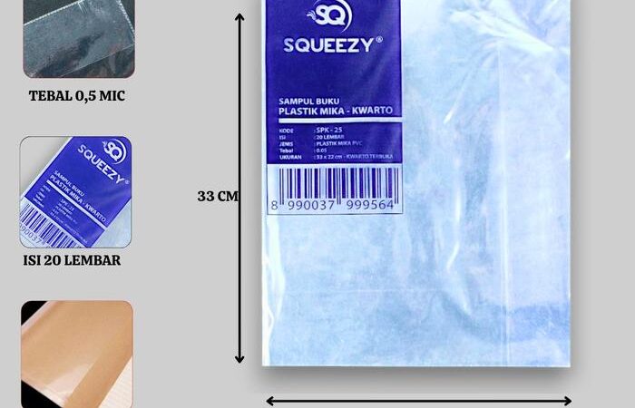Sampul Plastik Mika KwartoTipe: SPK-25. Ukuran: 22 x 33 cm. Ketebalan: 0.05 mm. Melindungi buku dari debu dan air.