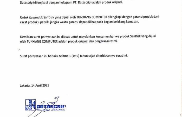 | Garansi | Garansi Resmi SanDisk Indonesia 5 Tahun dengan ketentuan Rusak Ganti Baru. |