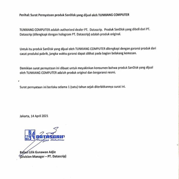 | Garansi | Garansi Resmi SanDisk Indonesia 5 Tahun dengan ketentuan Rusak Ganti Baru. |