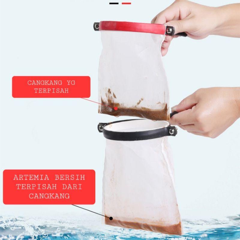 - Gunakan lapisan merah untuk memisahkan cangkang, lalu ambil Artemia bersih dari lapisan hitam.