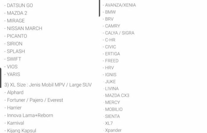 | L | Avanza/Xenia, BRV, Civic, Ertiga, HRV, Xpander, Rush/Terios, Mobilio | Untuk Sedan Panjang & Small MPV |