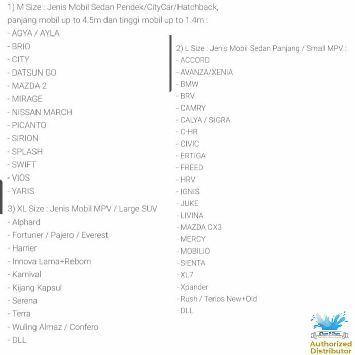 | L | Avanza/Xenia, BRV, Civic, Ertiga, HRV, Xpander, Rush/Terios, Mobilio | Untuk Sedan Panjang & Small MPV |