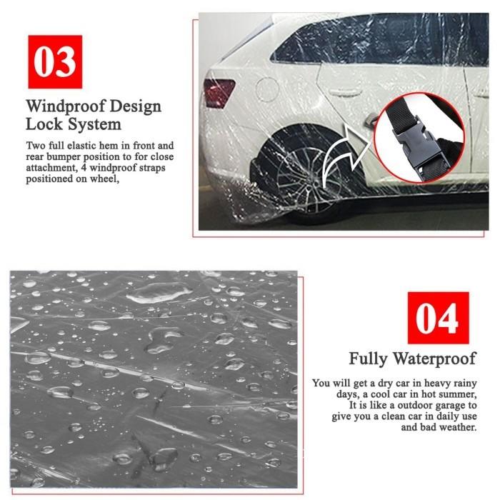 Lindungi investasi mobil Anda dari hujan, panas, dan kotoran dengan sarung mobil premium berkualitas. Terbuat dari material Plastik Polyethylene (PE) berketebalan 70 micron, sarung ini menjamin perlindungan super kuat dan 100% tahan air (full waterproof). Dibandingkan produk sejenis di pasaran yang hanya 50-60 micron, sarung kami jauh lebih tebal, awet, dan anti sobek.