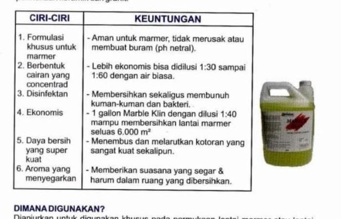 | Keamanan | pH netral yang aman untuk permukaan marmer sensitif |